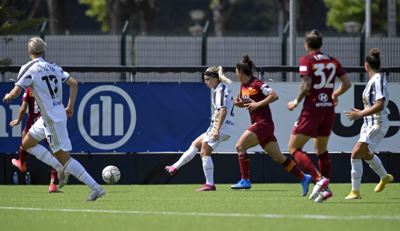 Visti gli ultimi confronti tra Juve e Roma, è lecito aspettarsi una grande partita. E i primi minuti confermano le attese: subito bianconere pericolose con Hurtig, lanciata a tu per tu con Ceasar da Cernoia, risposta giallorossa con una doppia occasione avviata da Serturini: decisiva la chiusura di Boattin. Le bianconere spaventano ancora la Roma con Hurtig, ma nessuna arriva sul suo cross in mezzo, e Cernoia, e al 18' trovano il vantaggio. Bellissima azione di Caruso e cross per Pedersen che, di testa, scrive l'1-0 per la Juve.